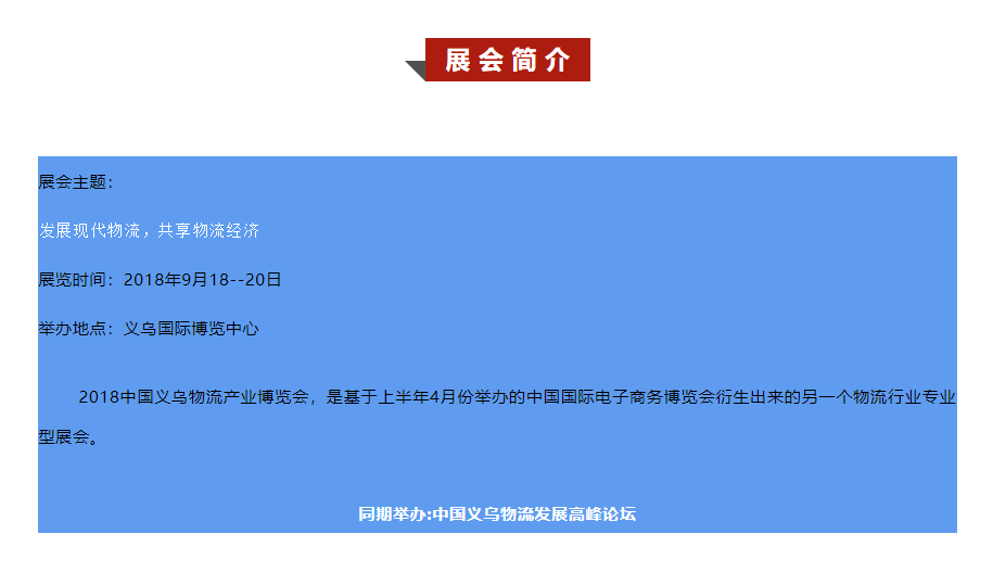 2018中國(guó)義烏物流產(chǎn)業(yè)博覽會(huì),是基于上半年4月份舉辦的中國(guó)國(guó)際電子商務(wù)博覽會(huì)衍生出來(lái)的另一個(gè)物流行業(yè)專業(yè)型展會(huì)。
