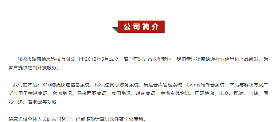 深圳市瑞康信息科技有限公司于2012年6月成立,落戶在深圳市龍華新區(qū),我們專注物流快遞行業(yè)信息化產(chǎn)品研發(fā),為客戶提供定制開(kāi)發(fā)服務(wù);