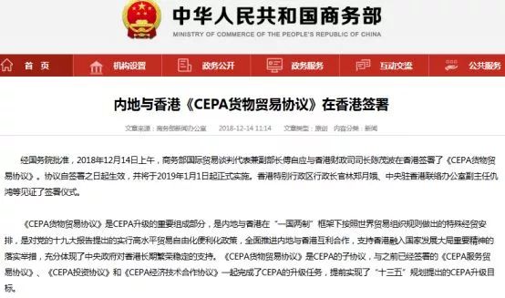 經(jīng)國務(wù)院批準(zhǔn),2018年12月14日上午,商務(wù)部國際貿(mào)易談判代表兼副部長傅自應(yīng)與香港財(cái)政司司長陳茂波在香港簽署了《CEPA貨物貿(mào)易協(xié)議》。