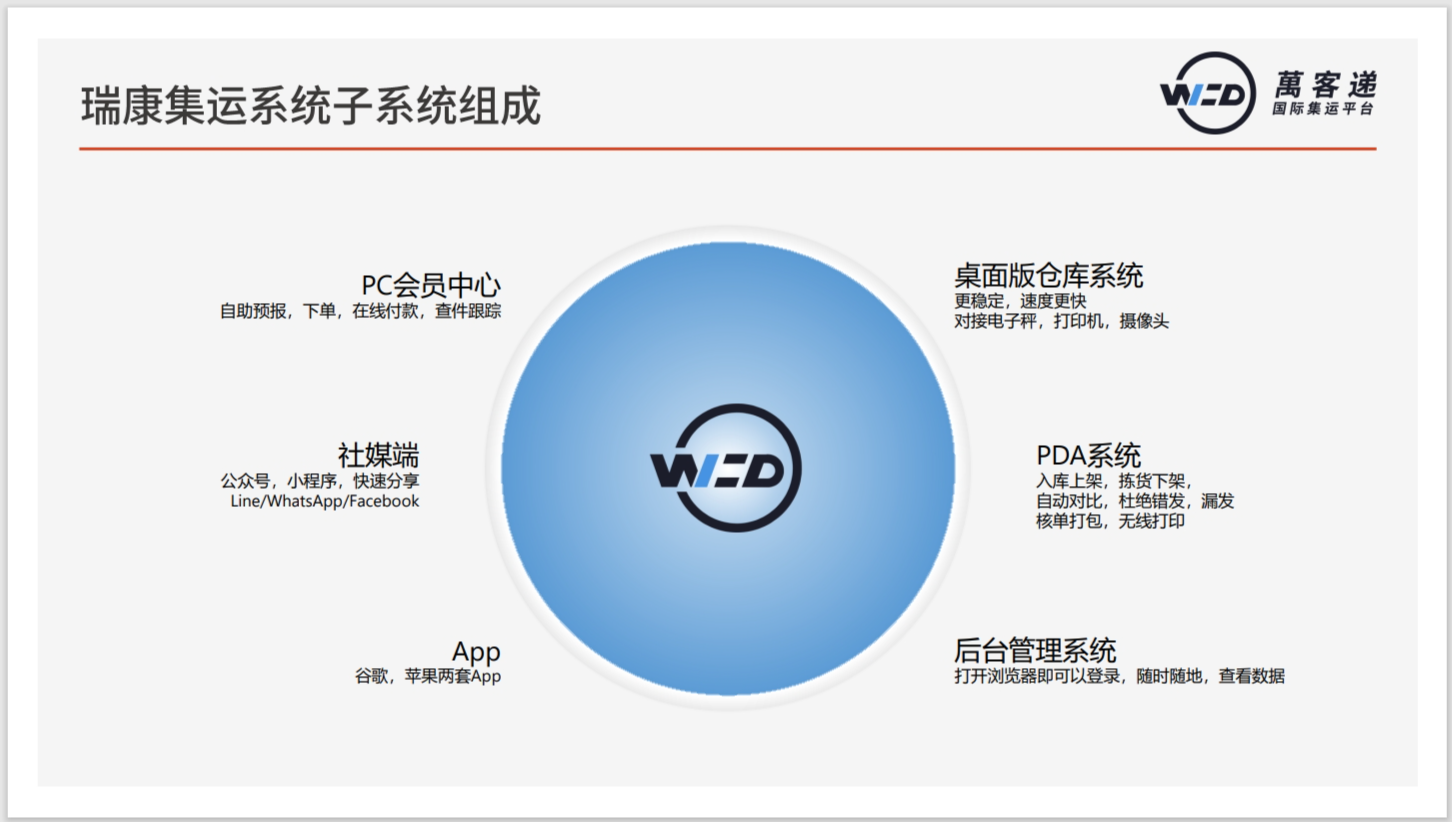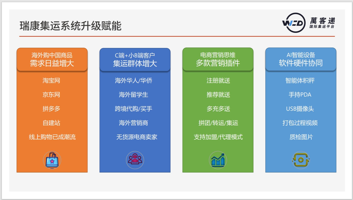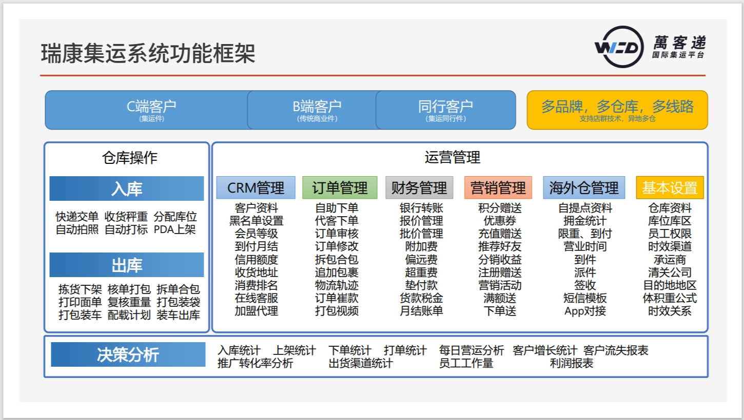 瑞康集運系統(tǒng)是專門為跨境集運服務商設計研發(fā)的集訂單管理、會員管理、財務管理、倉儲管理為一體的信息化系統(tǒng)。