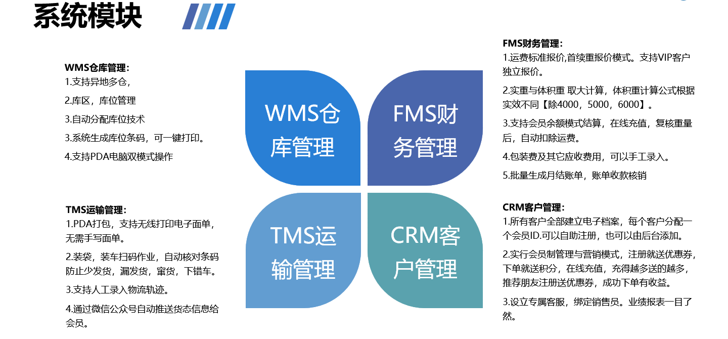 適用于國際專線物流、空運物流、海運、陸運拼、拼箱拼柜、FBA等業(yè)務模式。對接微信公眾號。物流軌跡主動推送給客戶 。一鍵批量生成月結賬單,財務收款審核更輕松。